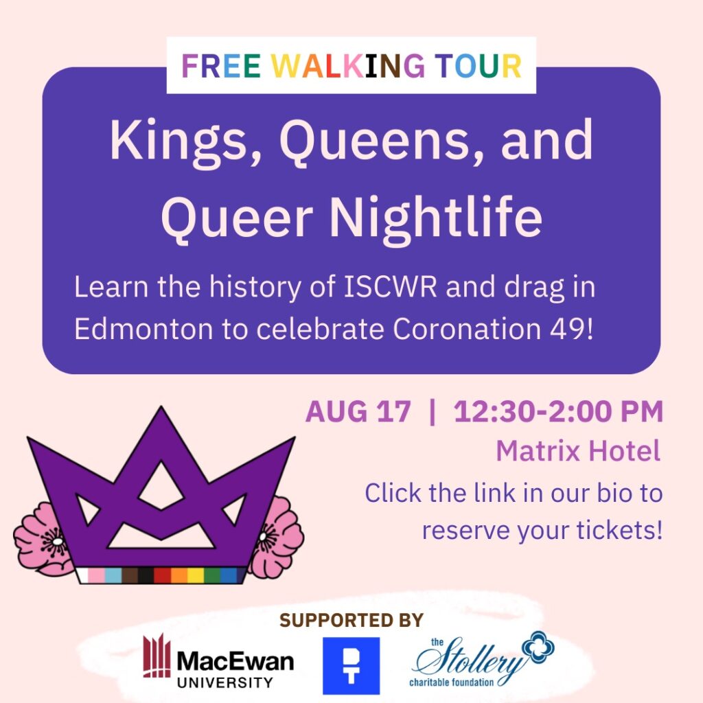 Learn more about the ISCWR, one of Alberta’s longest-running queer groups, and so much more about Edmonton drag history from Emperor 25 and 29 Ron and Emperor 26, 28, 36, and 46 Rob. Tour will start and end at the Matrix Hotel, venue for this year’s Coronation.
