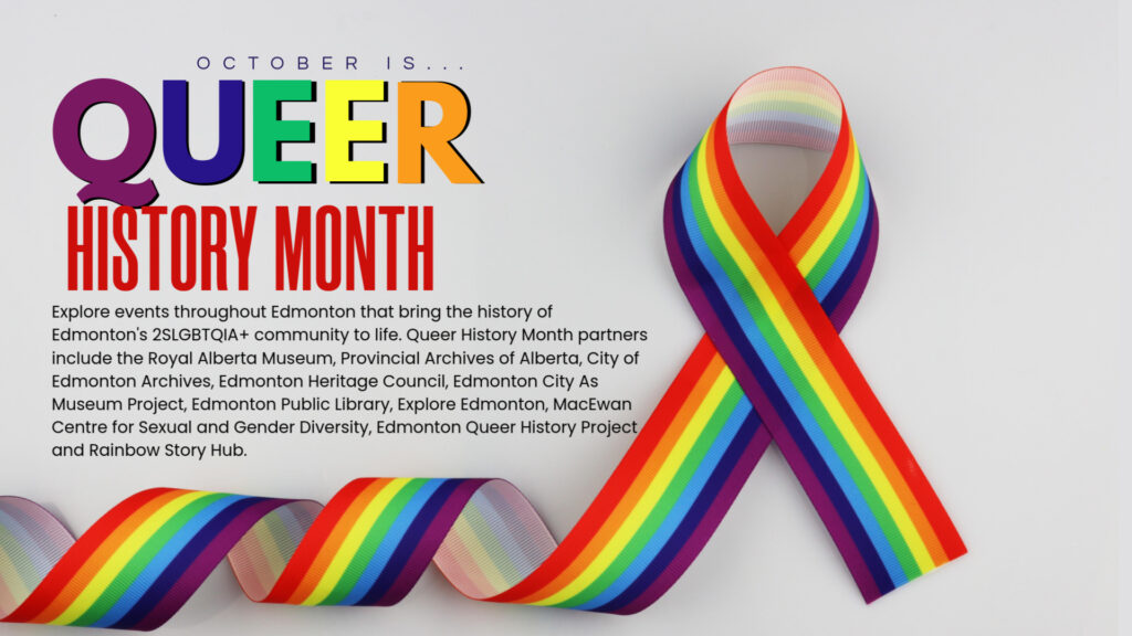 Queer History Month partners include the Royal Alberta Museum, Provincial Archives of Alberta, City of Edmonton Archives, Edmonton Heritage Council, Edmonton City As Museum Project, Edmonton Public Library, Explore Edmonton, University of Alberta Library, MacEwan Centre for Sexual and Gender Diversity, Edmonton Queer History Project and Rainbow Story Hub Foundation.